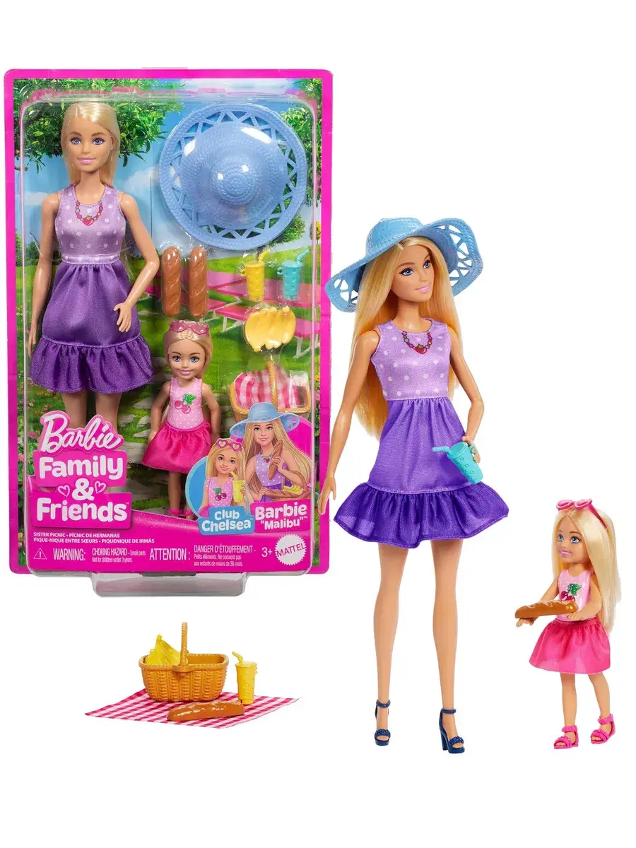 Игровой набор позволит детям отправить любимую куклу Барби и ее младшую сестру Челси на пикник. Старшая девочка привлекает внимание ярким фиолетовым платьем и большой голубой шляпой. На ногах у нее — темно-синие босоножки на каблуке. Также модно одета и Челси: ее наряд состоит из розового платья и босоножек в тон ему, на голове — солнцезащитные очки. Девочки приготовили для пикника все необходимое и сложили продукты в корзинку.